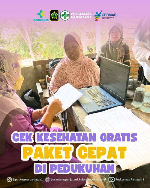 Pada Bulan Juni ini, Puskesmas Panjatan I melaksanakan Cek Kesehatan Gratis paket Cepat di beberapa pedukuhan. Kegiatan ini dimaksudkan sebagai percepatan CKG yang dapat diakses oleh semua warga. CKG paket Cepat ini meliputi skrining mandiri, pemeriksaan berat badan, tinggi badan, lingkar perut, lingkar lengan atas, tekanan darah, kadar gula darah, serta pemeriksaan dan konsultasi oleh dokter ???????????