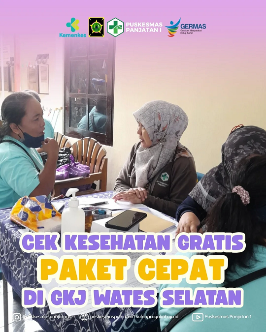 Tanggal 28 Juni lalu Puskesmas Panjatan I berkerja sama dengan GKJ Wates Selatan melaksanakan Cek Kesehatan Gratis (CKG) bagi masyarakat umum. Pelaksanaan CKG ini dilakukan oleh GKJ Wates Selatan dalam rangka HUT ke 30 GKJ Wates Selatan. Selain kegiatan CKG, panitia penyelenggara juga dilaksanakan senam bersama, jalan sehat, donor darah, bazar UMKM, serta pembagian doorprize. Dengan adanya kerja sama ini diharapkan masyarakat dapat lebih mudah untuk mengakses layanan kesehatan serta meningkatkan kesadaran masyarakat akan pentingnya pemeriksaan kesehatan secara rutin???????????