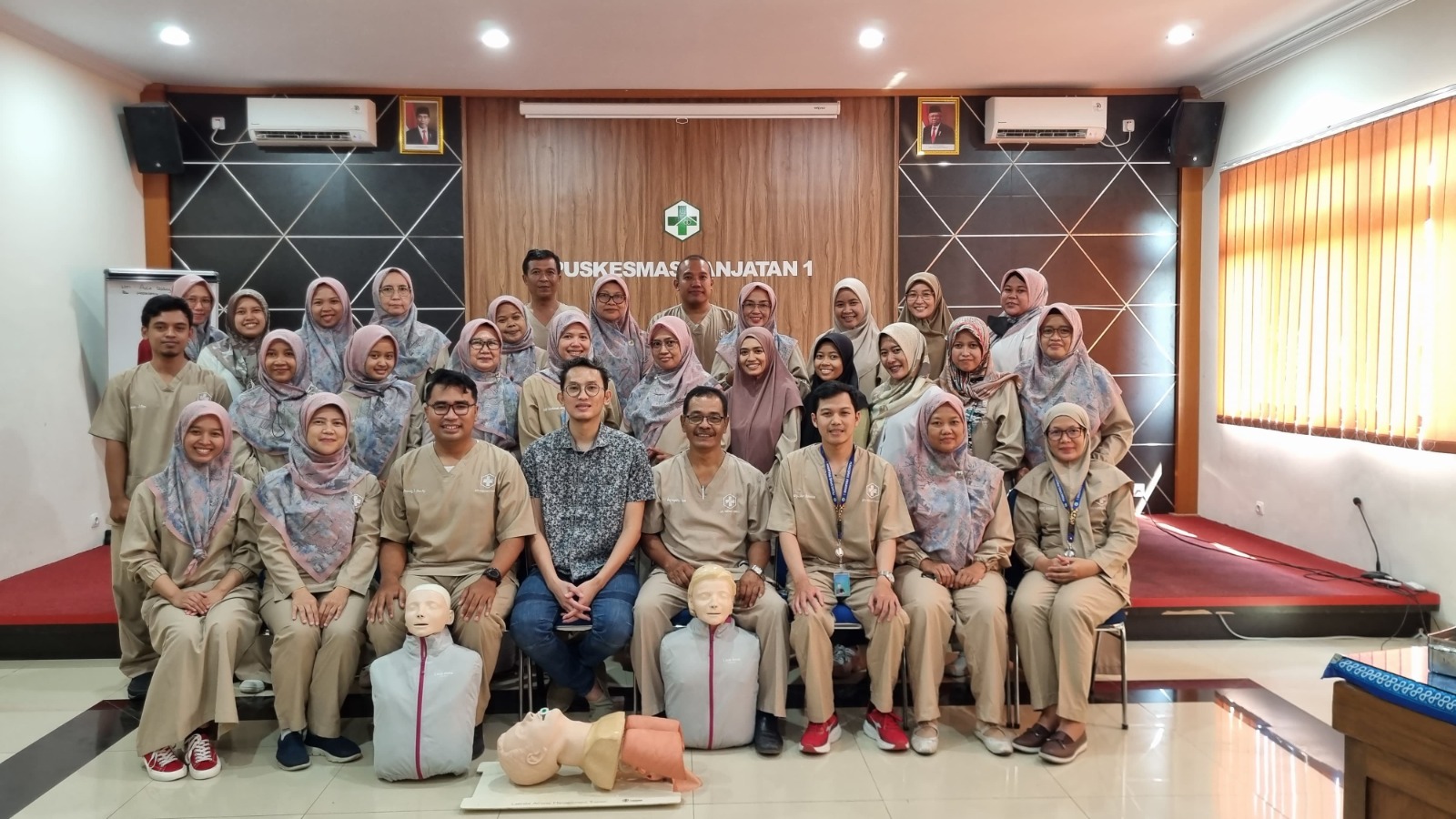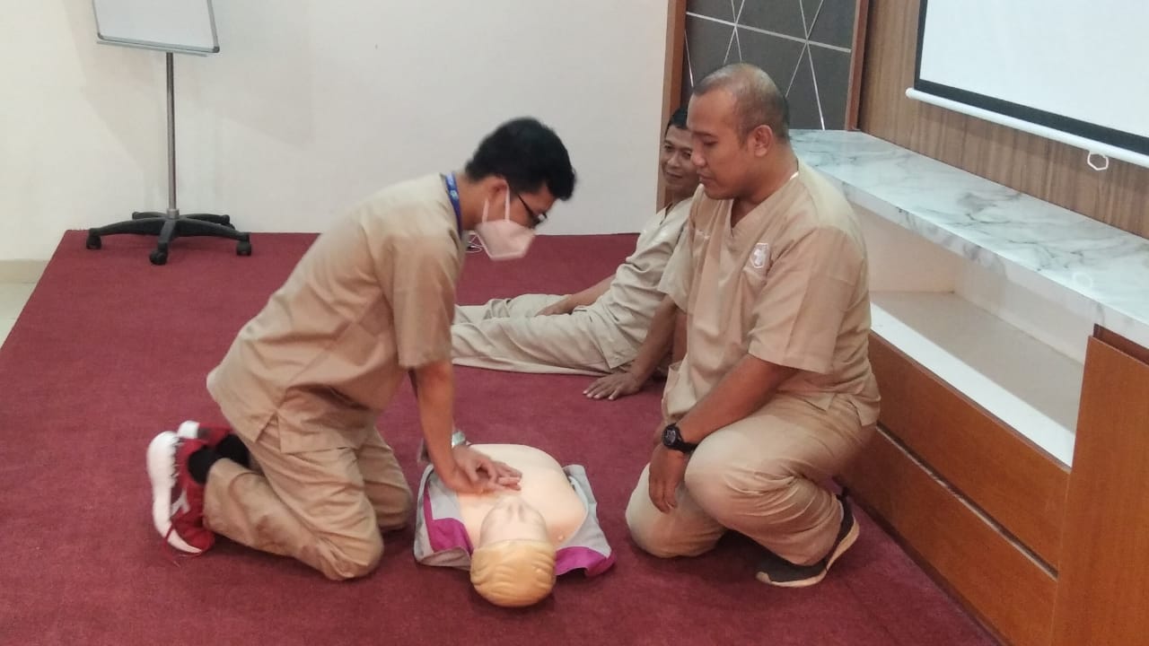 drg. Nur Rohman sedang memperagakan cardio pulmonary resusitasi (pijat jantung)