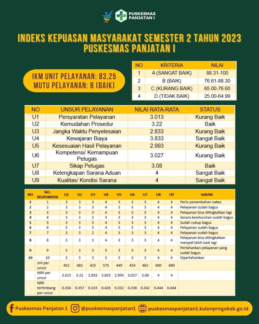 Pada semester 2 tahun 2023 Puskesmas Panjatan I mendapatkan nilai 83,25 dengan kategori baik.
